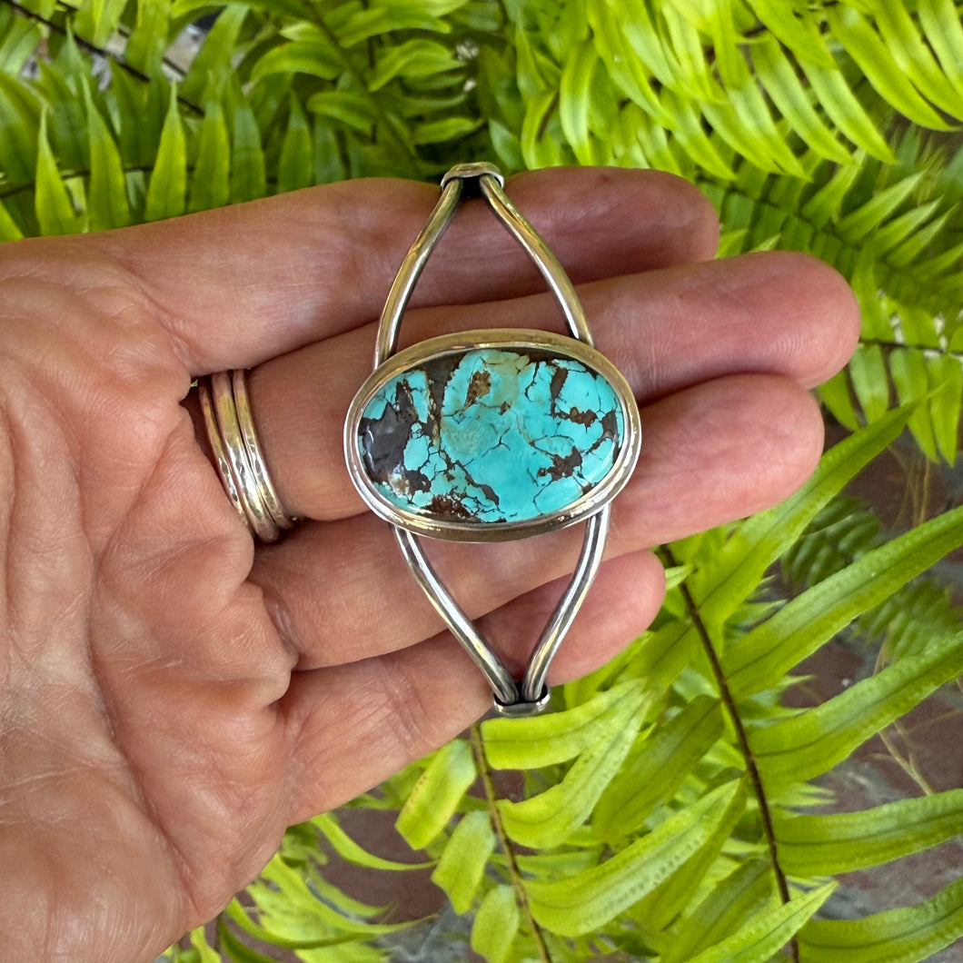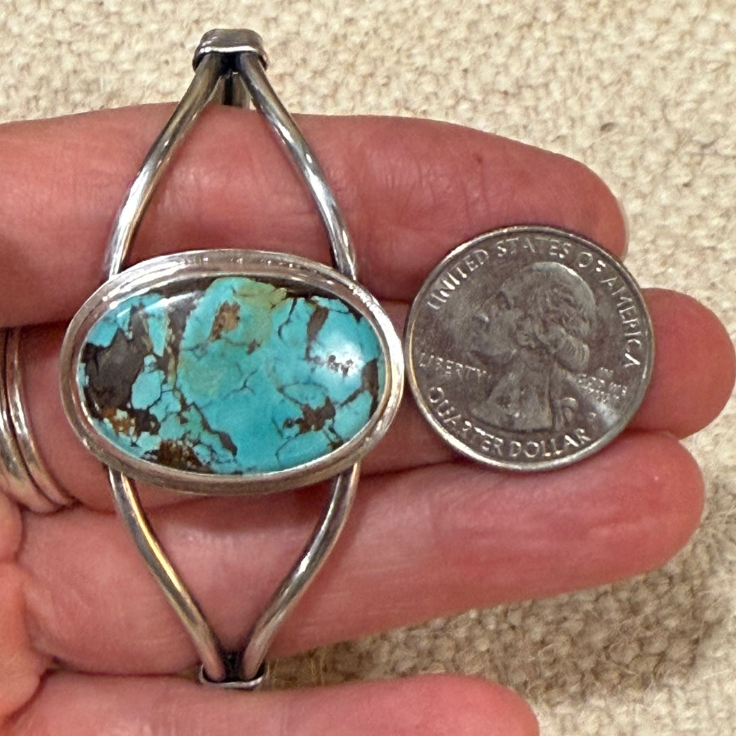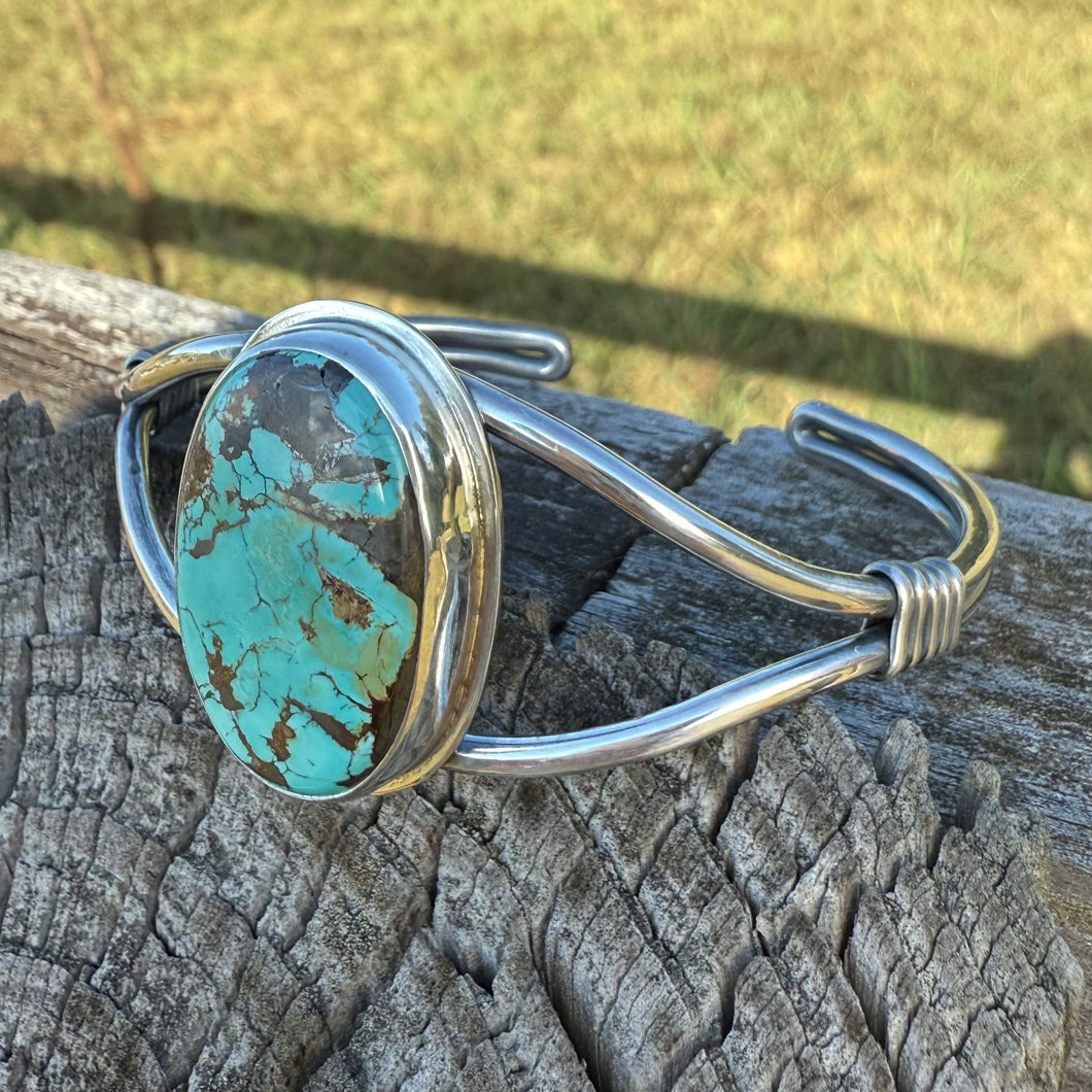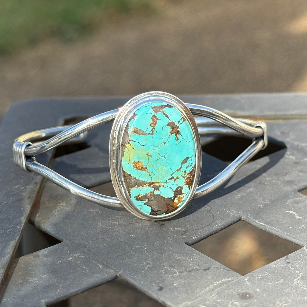 Bezel set Sierra Nevada turquoise cuff bracelet. This bracelet is completely hand made in sterling silver. The entire bracelet has been lightly oxidized to highlight the wrapped details on either side of the turquoise. The turquoise stone is a beautiful blue green color with brown matrix and a slight bit of gold. It is approximately 1 1/8 inches long and 3/4 inch wide. This bracelet is approximately 6.25 inches in diameter with a one inch opening. It will comfortably fit a wrist from 6-7 inches in diameter. Please note this listing is for the cuff bracelet only and does not come with the Navajo Pearl and copper bracelets pictured with it.