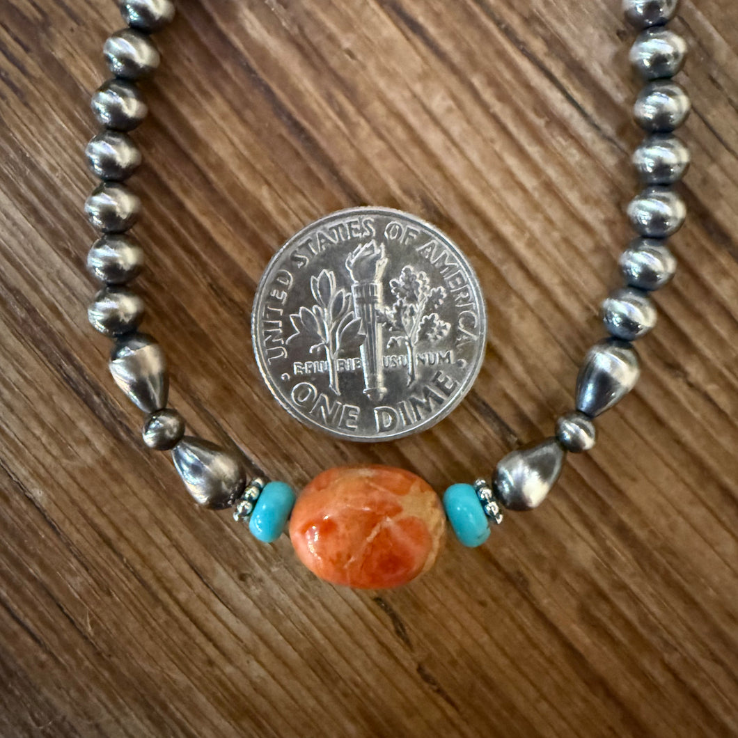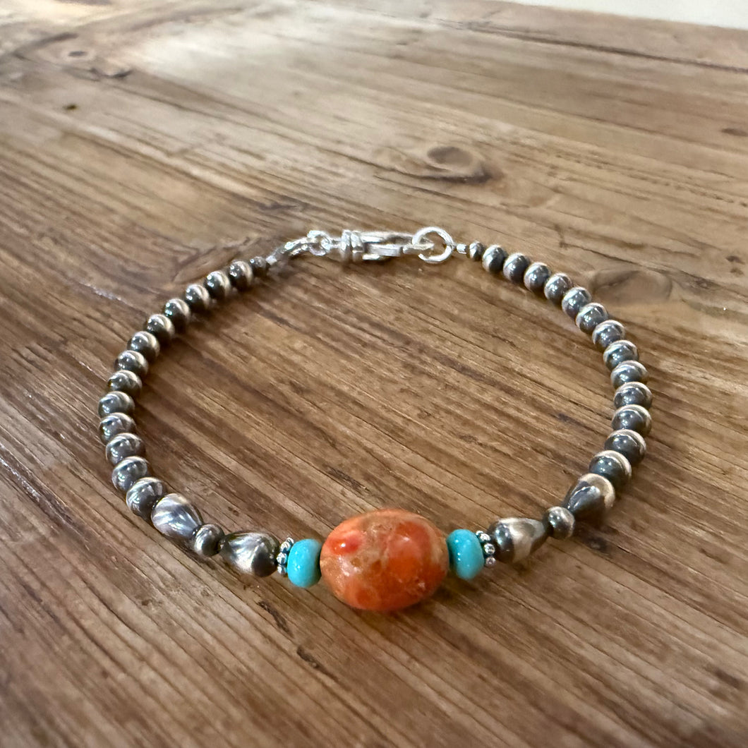 Navajo pearl, apple coral and turquoise bracelet. The Navajo pearls are 3mm and 4mm in size with 4x6mm tear drops. Bali style spacers sit on either side of the turquoise stones. The pearls and spacers are sterling silver - not plated. The genuine turquoise beads are a beautiful blue green color. They are approximately 4mm in size. The apple coral is also approximately 8x10mm in size. Sterling silver end rings and swivel clasp. True southwestern style! This bracelet is approximately 7 3/8 inches long.