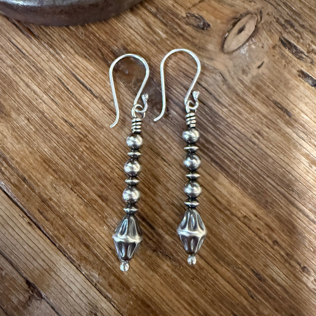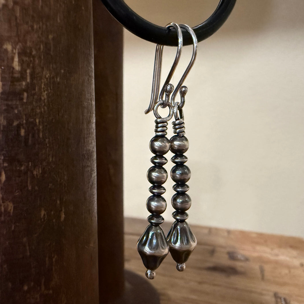 Navajo pearl dangle earrings made with 4mm Navajo pearls, 3.3mm saucers and textured oval pearls. The pearls and saucers are all sterling. The french ear wires are hand crafted in sterling silver. Light weight, comfortable and super neutral! These earrings are approximately 1 7/8 inches long from the top of the ear wire to the bottom of the pearls.