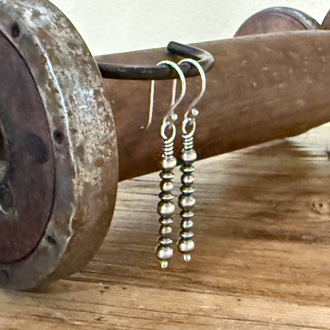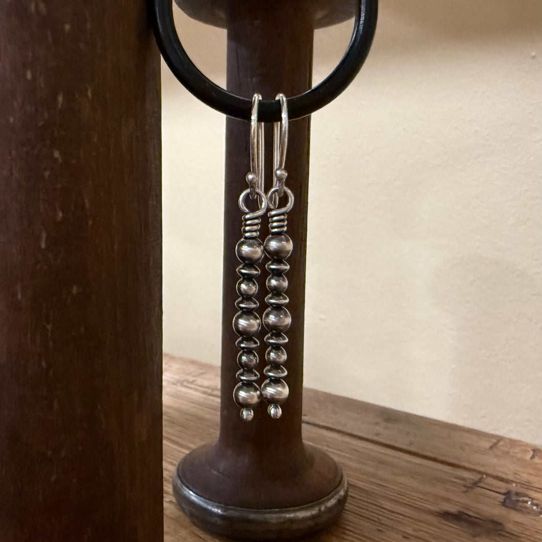 Navajo pearl dangle earrings made with 3mm and 4mm Navajo pearls and 3.3mm saucers. The pearls and saucers are all sterling. The french ear wires are hand crafted in sterling silver. Light weight and comfortable and neutral. These earrings are approximately 1 3/4 inches long from the top of the ear wire to the bottom of the pearls.