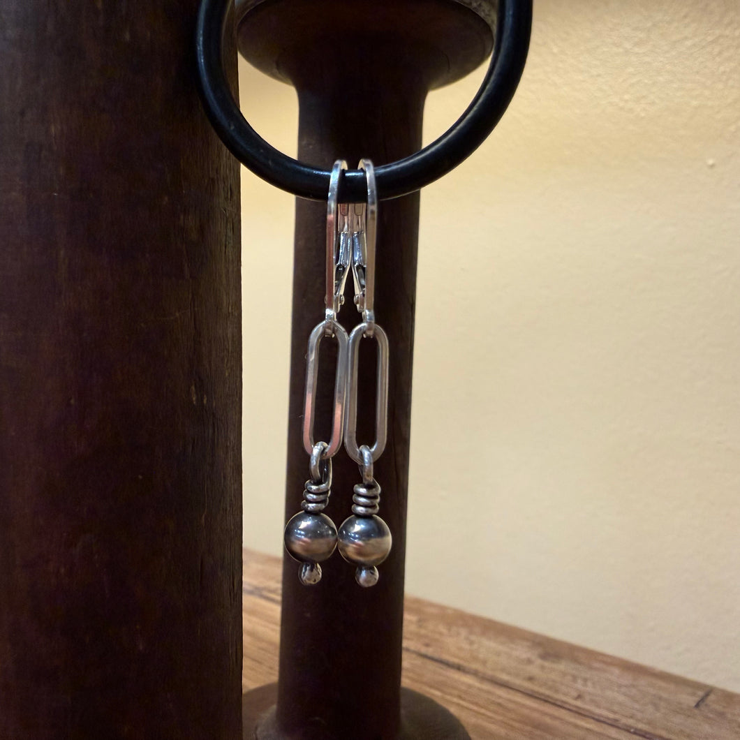 Oxidized sterling silver paperclip chain links hang from sterling lever back ear wires. Sterling wire wrapped Navajo pearls hang from the end of the links. The pearls are 5mm in size and are sterling silver - not plated. So lightweight you’ll forget you have them on! Effortless style and perfectly neutral! These all earrings are approximately 1 1/2 inches long from the top of the ear wire to the bottom of the wire wrapped pearls.
