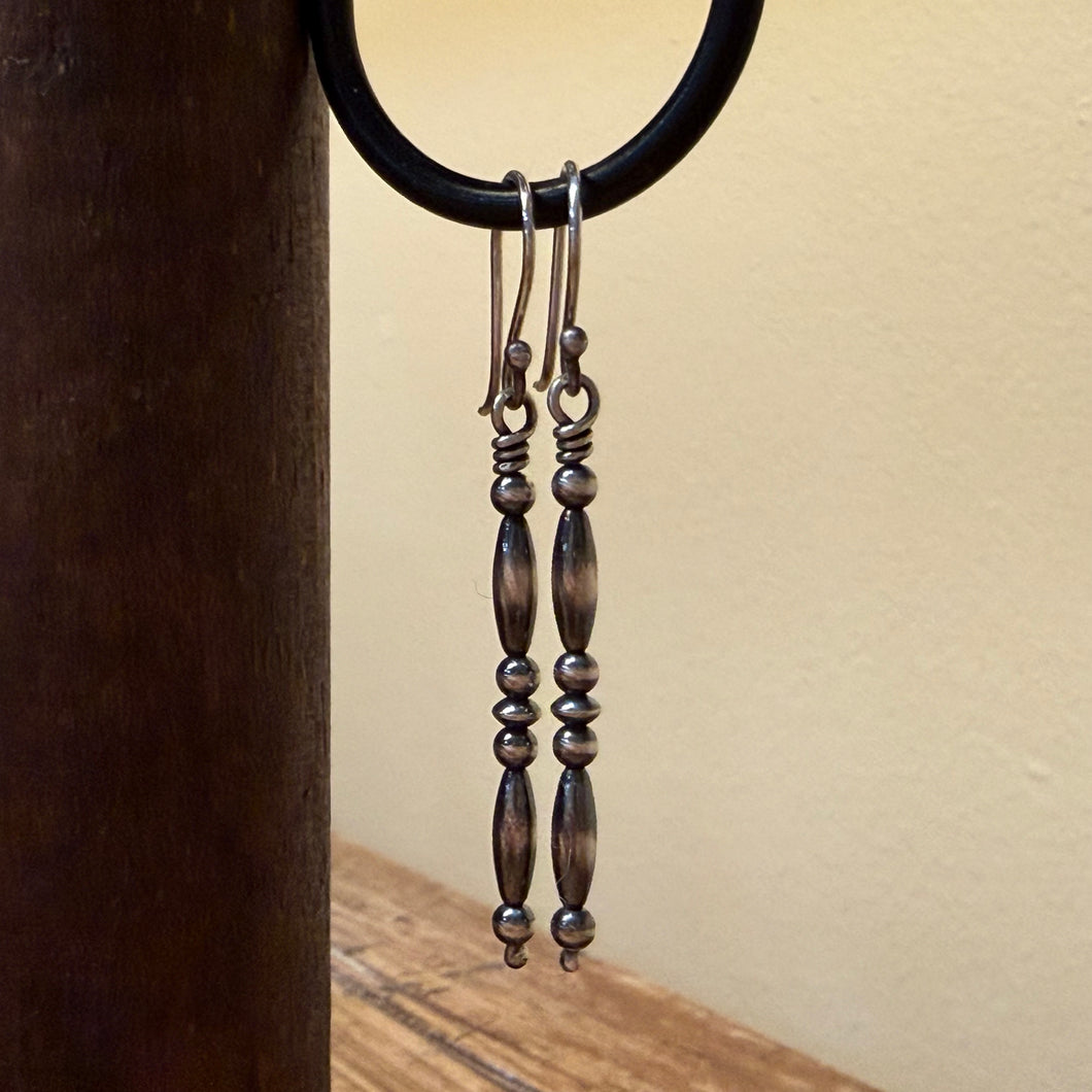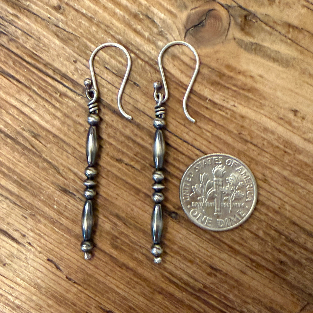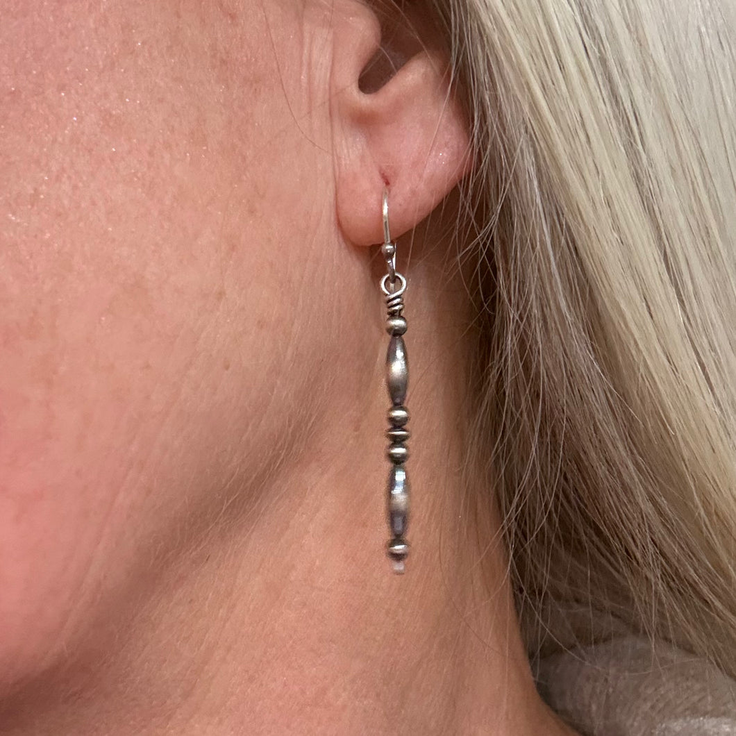 Sterling silver Navajo pearl dangle earrings made with 3mm round pearls, 3x9mm torpedo shaped pearls and 3.3mm saucer pearls . They are wire wrapped and hang from hand crafted ear wires. All materials are sterling silver. Light weight, comfortable and super neutral! These earrings are approximately 2 inches long from the top of the ear wire to the bottom of the pearls.