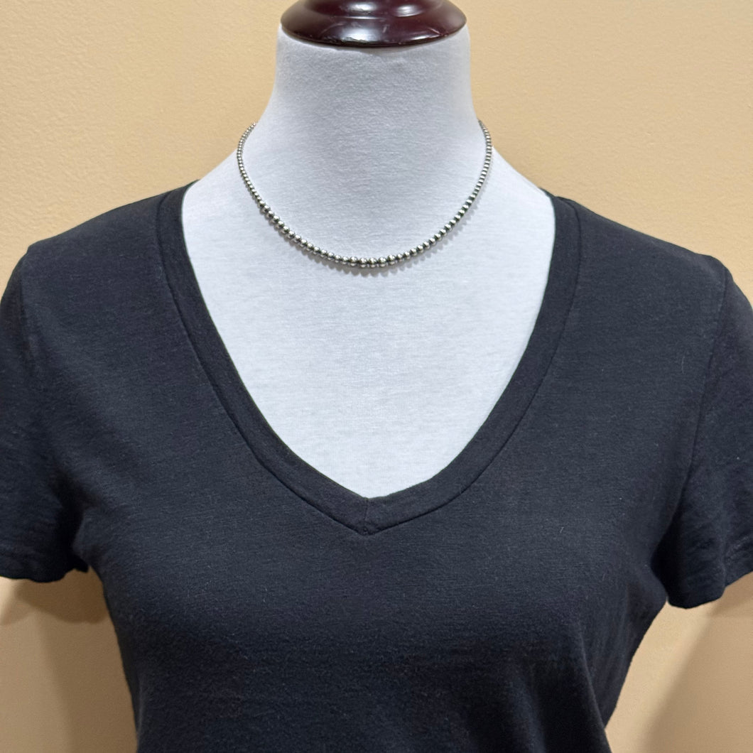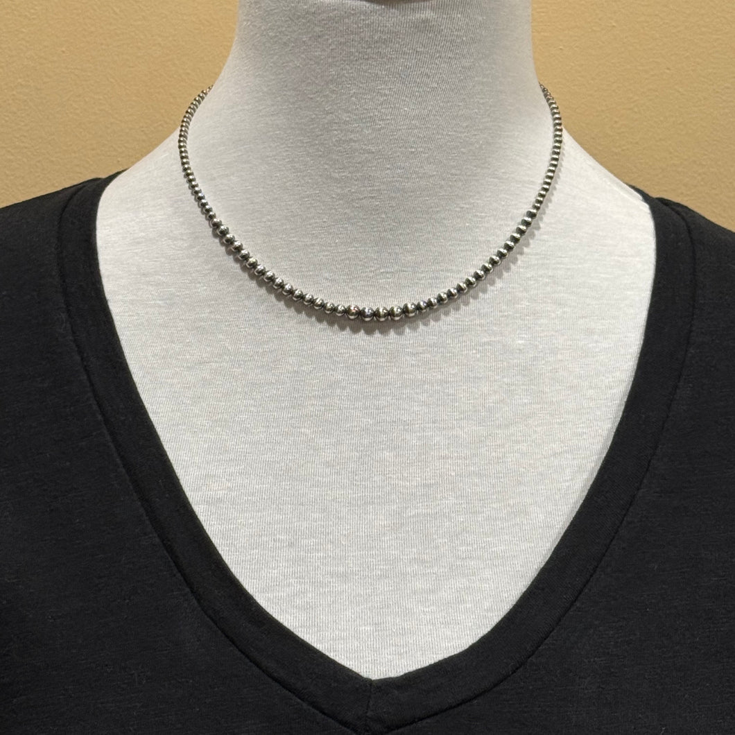 Graduated Navajo pearl necklace. The pearls are 2mm, 3mm, 4mm and 5mm in size. The pearls are sterling silver, not plated. Sterling silver lobster claw clasp and end rings. Such a classic and timeless style - a must have for any jewelry wardrobe. This necklace's versatility will quickly make it your favorite piece. It’s dainty size makes it an easy choice for every day wear. This necklace is approximately 17 inches long.