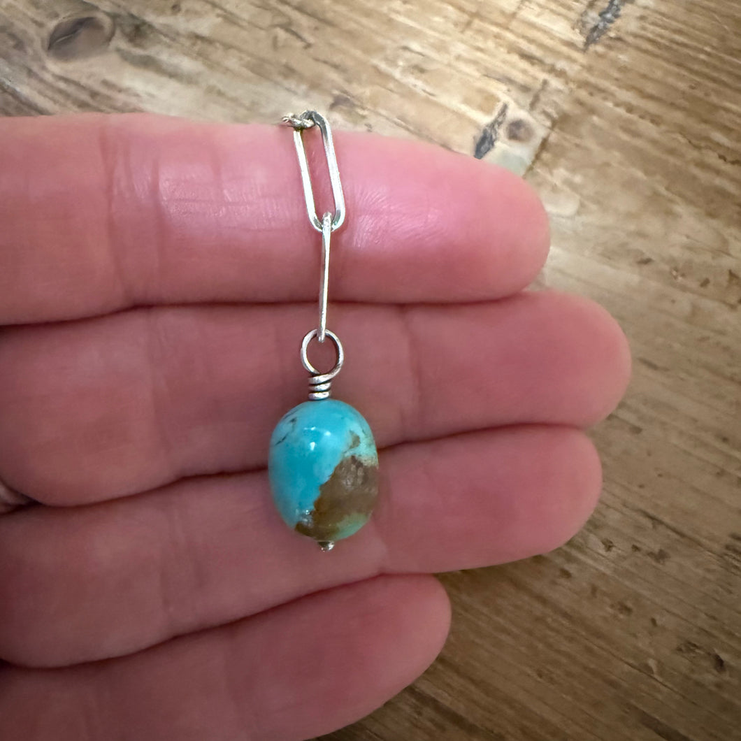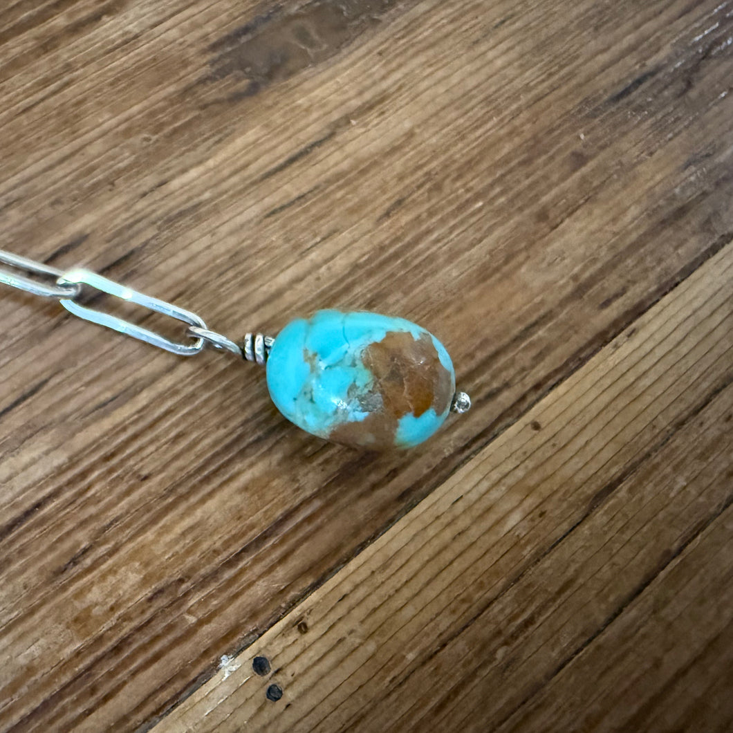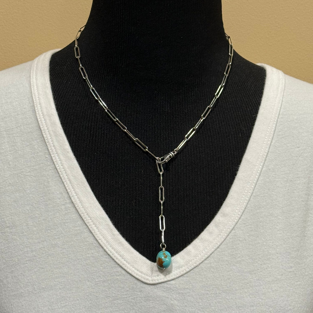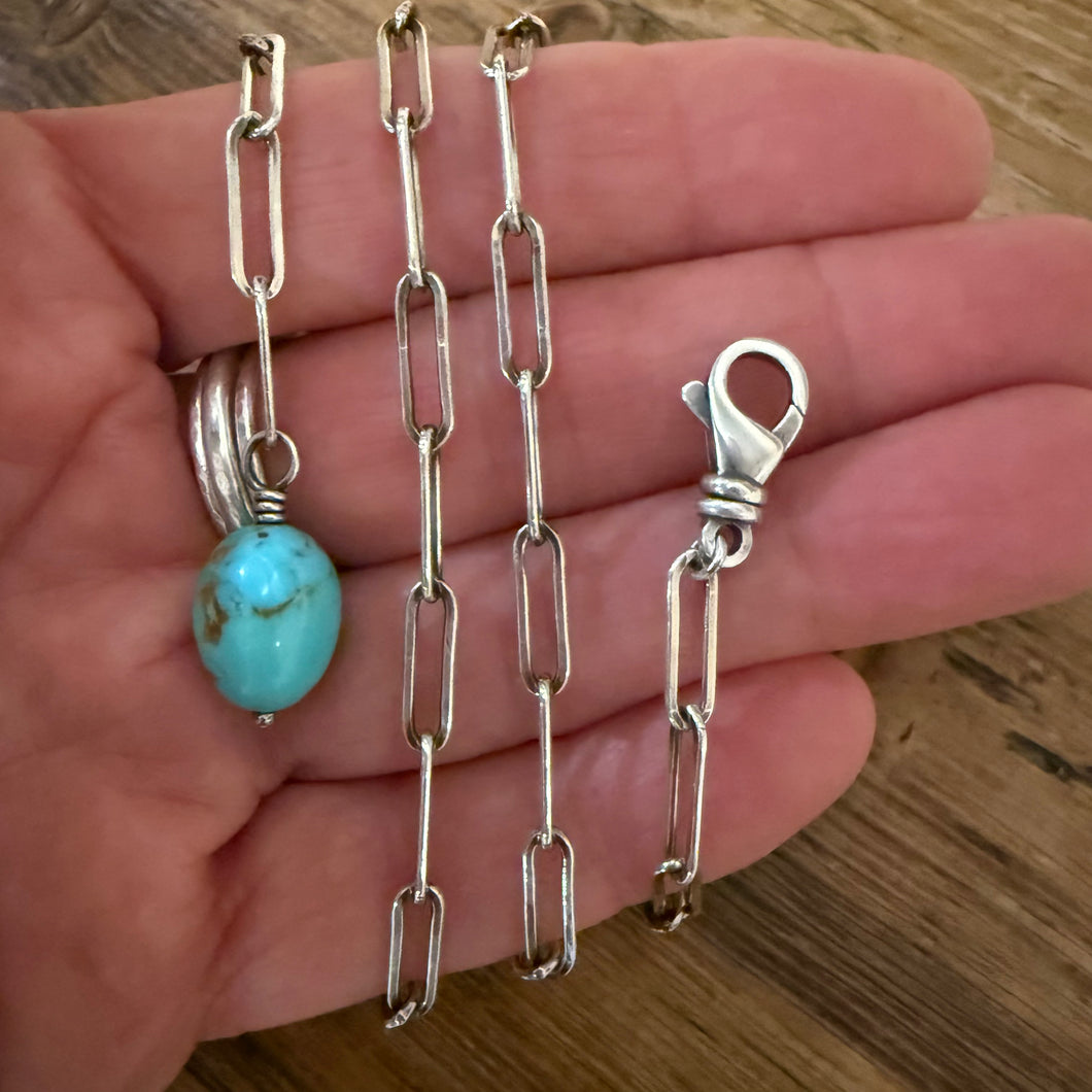 Sterling silver paperclip chain lariat necklace with a potato shaped Kingman turquoise bead. This necklace is oxidized and has a wonderful warm finish. This chain is the real deal and substantial in size. The links are solid and are approximately 1/2 inch x 1/8 inch. The turquoise bead is approximately 10x13mm in size and is wire wrapped in sterling. A sterling swivel clasp allows you to adjust the length of the lariat- you can wear it from 14-2O inches. So many options with this unique piece!