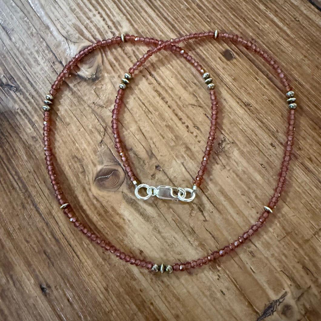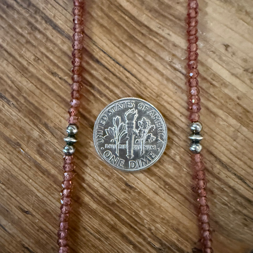 This Mozambique garnet necklace features 2.2mm faceted garnet beads and sterling Navajo pearls and saucers. The garnets are AAA quality and have a beautiful brownish red color. The 3mm Navajo pearls and 3.3mm saucers are sterling silver - not plated. Garnets are the birthstone for January. This necklace is approximately 17.75 inches long. It layers beautifully and it adds gorheous color to your jewelry wardrobe.