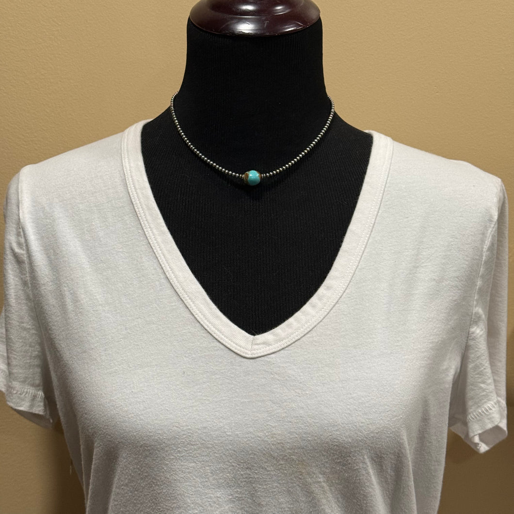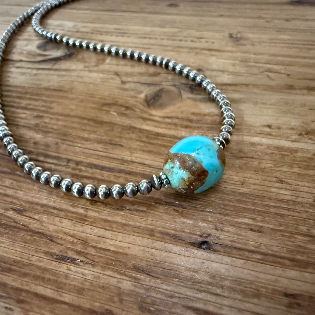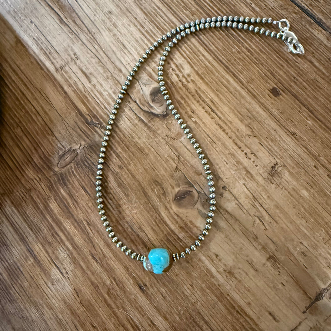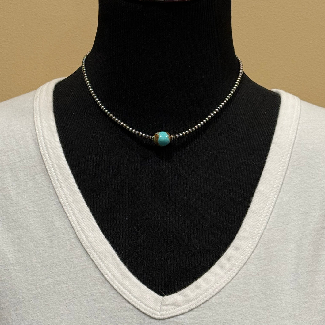 Navajo pearl and Kingman turquoise necklace. The Navajo pearls are sterling silver- not plated. They are 3mm in size. Spaced through out the necklace are 3.3mm sterling saucers. The genuine Kingman turquoise bead is approximately 10x13mm. The turquoise is a beautiful blue green color with brown matrix. Bali style spacers sit on either side of the turquoise stone. They are sterling silver. The end links and lobster clasp are also sterling silver. This is a great addition to any Navajo pearl collection! This necklace is approximately 16 inches long. It looks great on it's own - but it layers beautifully as well!