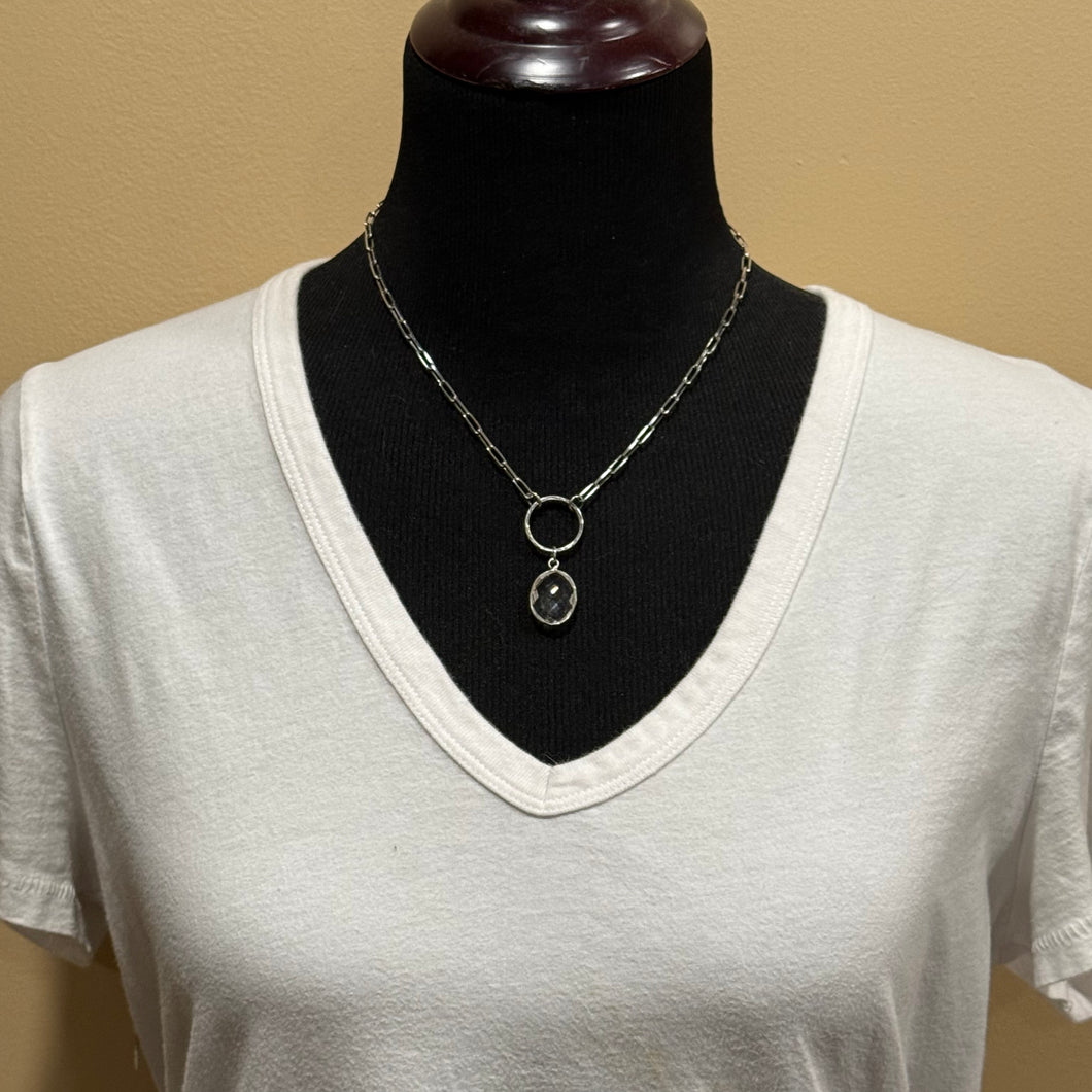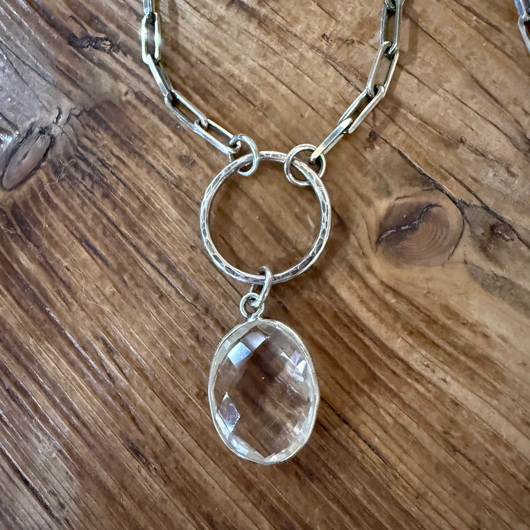 Sterling silver paperclip chain necklace featuring a hand crafted hammered sterling silver circle and a sterling bezel crystal quartz pendant. So neutral and so eye catching. This will easily be a favorite in any jewelry wardrobe. The necklace is approximately 18” long. The crystal pendant is approximately 18mm long. The hammered circle is approximately .75 inch outer diameter.