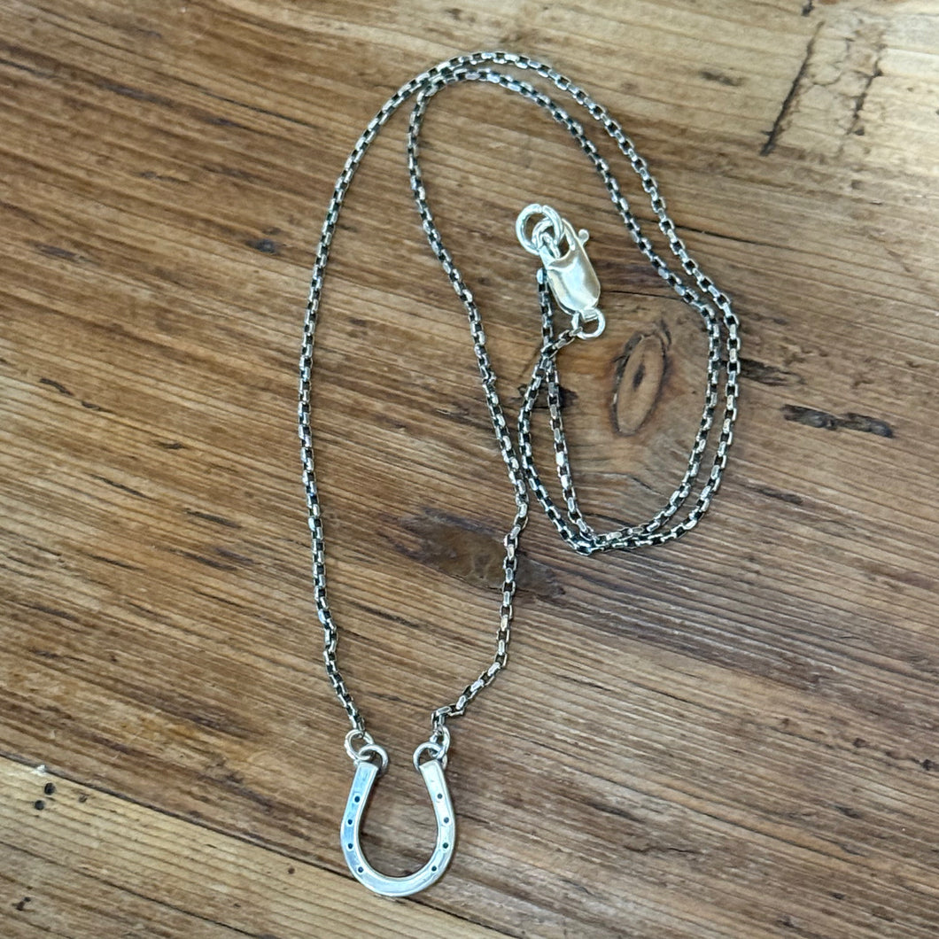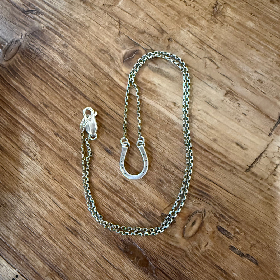 Handcrafted sterling silver horse shoe necklace. This horse shoe is completely forged by hand in 12 gauge sterling silver. It hangs from a sterling boxy oval cable chain. The chain is lightly oxidized. It’s the perfect gift for the horse lover- no matter what discipline she rides in! This necklace is approximately 18 inches long. The horse shoe is approximately 1/2 inch at its widest point and is approximately 5/8 inch tall.