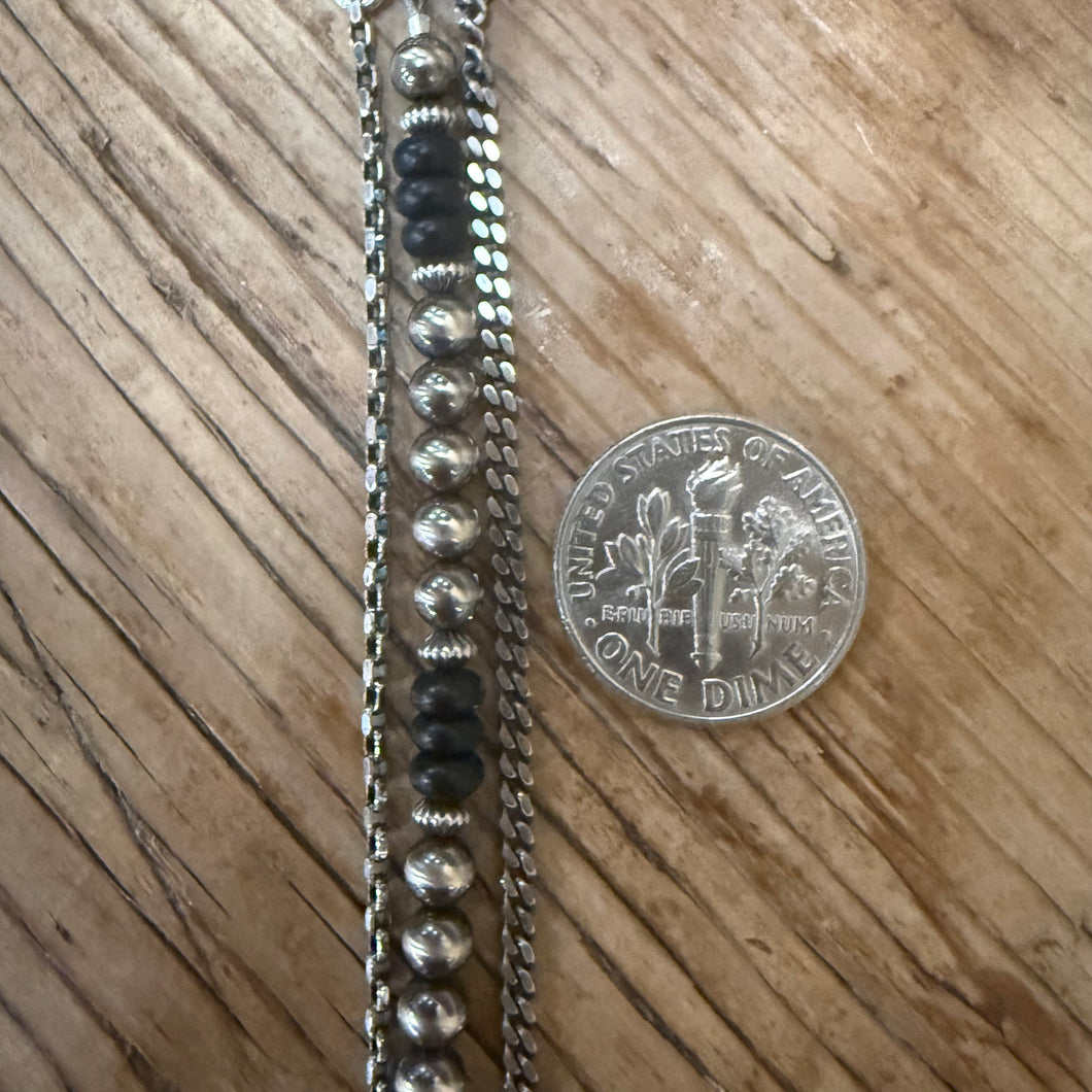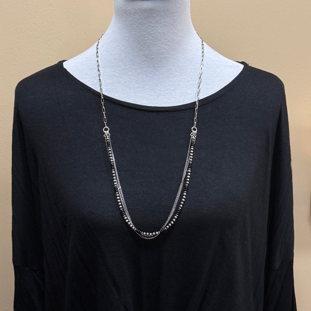 Paperclip chain necklace with layers of Navajo pearls and black onyx, oval cable chain and diamond cut flat curb chain.  The Navajo pearls are 4mm in size with 3.3mm corrugated saucer pearls. The matte black onyx is 4mm in size. The chains have been lightly oxidized. The pearls, chains, jump rings and clasp are all sterling silver. This is a great year round piece that will complete any outfit!