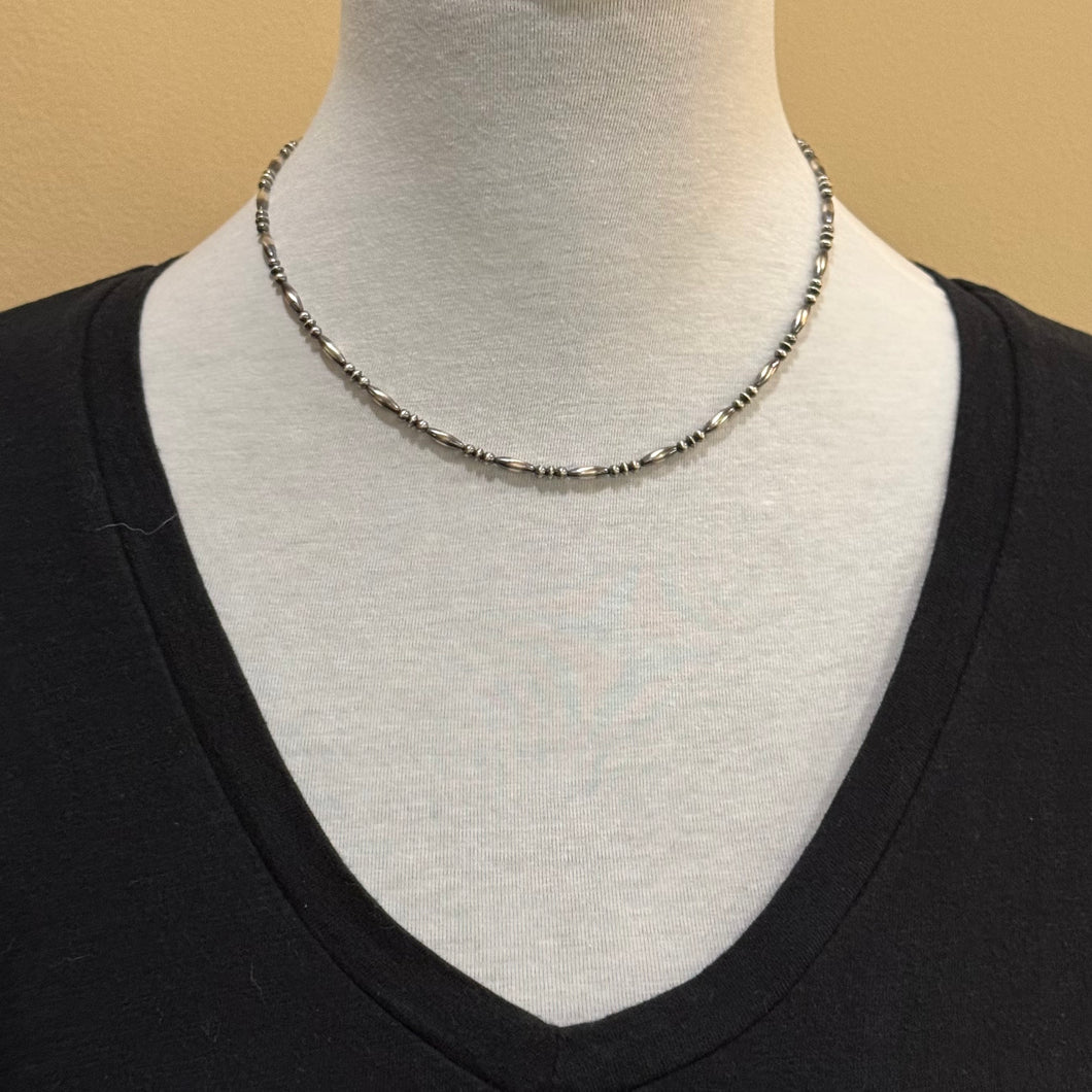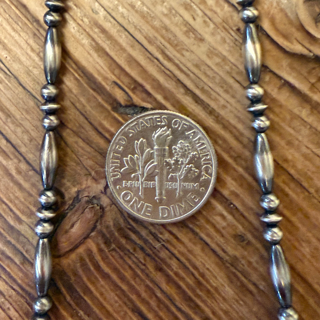Dainty sterling Navajo pearl necklace with sterling end links and clasp. These Navajo pearls 3mm in size with 3x9mm torpedo shaped pearls and 3.3mm saucers. They are sterling silver- not silver plated. This neutral necklace is a staple for every jewelry wardrobe. It’s dainty size makes it easy to wear every day. Layer it with more strands for a classic southwestern look. This necklace is approximately 17.25 inches long.