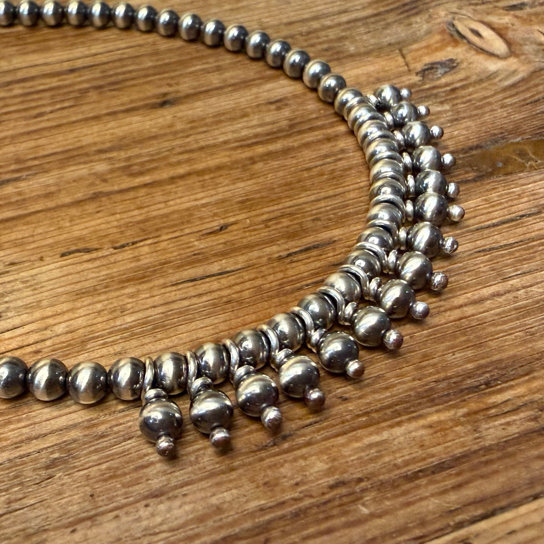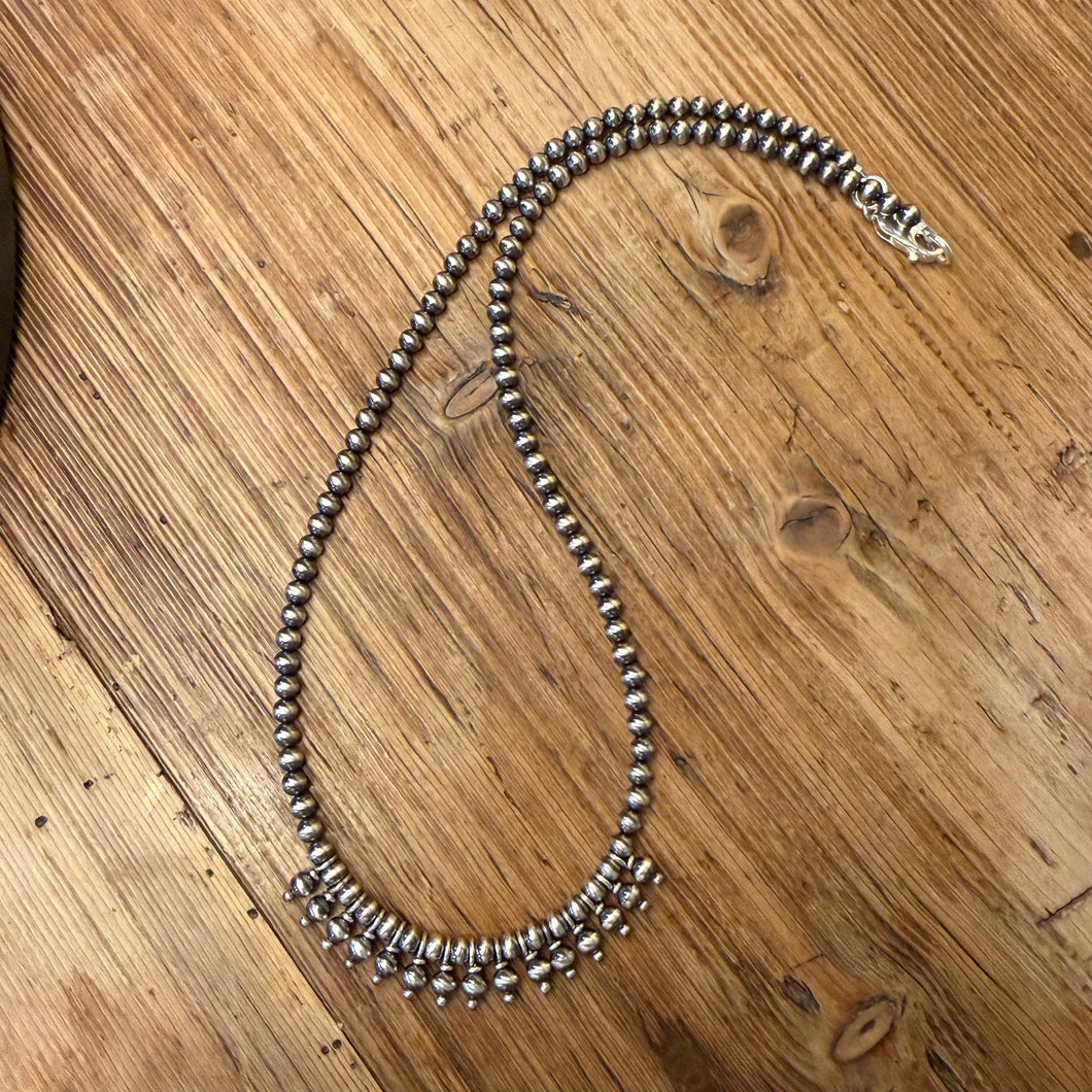 Two tier Navajo pearl necklace. The Navajo pearls are 4mm in size. The second tier consists of 4mm Navajo pearl charms that are wire wrapped in sterling silver. The pearls are sterling silver - not plated. This necklace is approximately 18 inches long. It’s design is interesting and allows you to wear it alone. It’s size makes it easy to layer.