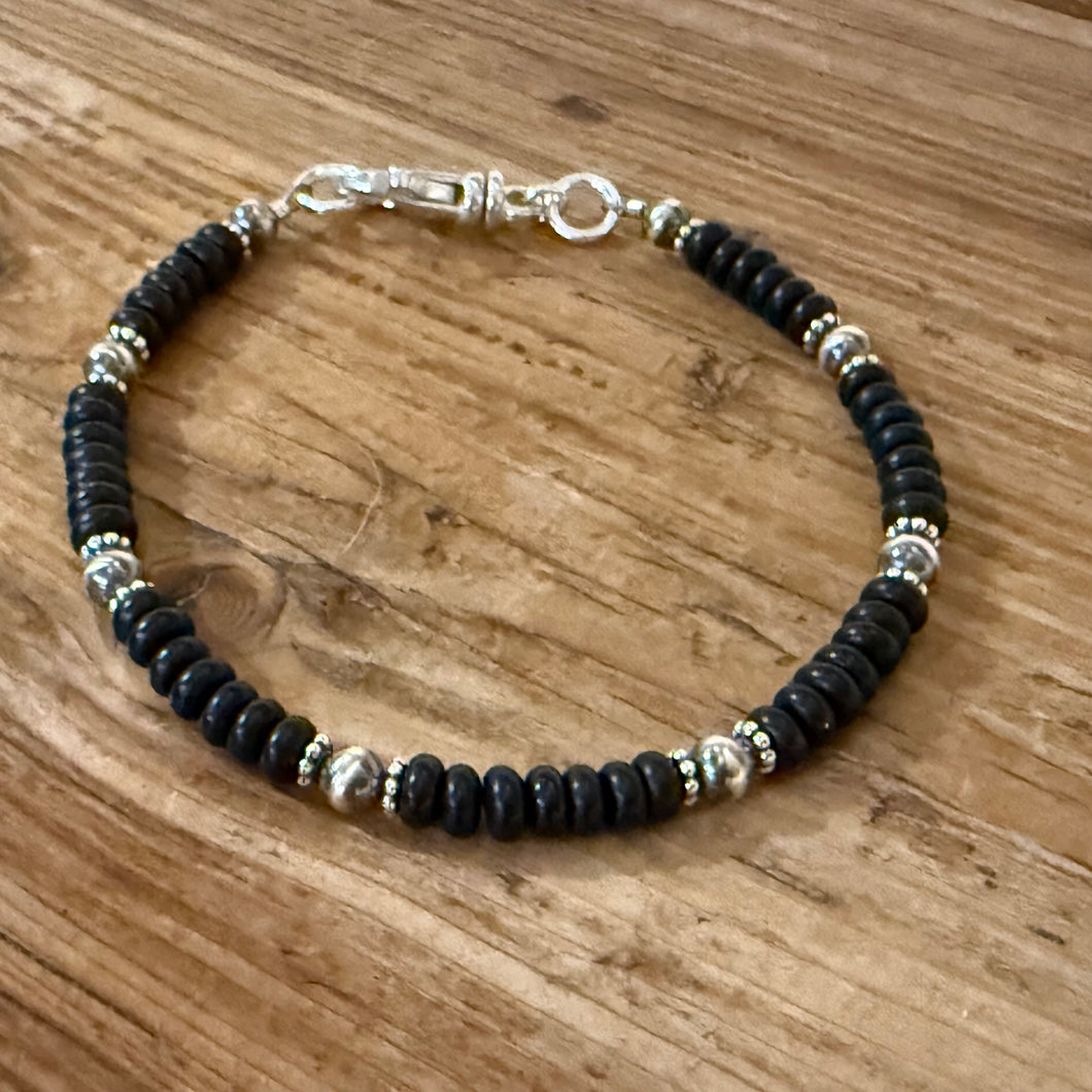 Black onyx and Navajo pearl bracelet. The pearls are 4mm in size with. They are sterling silver - not plated. The smooth black onyx beads are 4mm in size. Bali style sterling spacers sit on either side of the Navajo pearls. Sterling swivel clasp and end rings. A classic color combination and southwestern style. Completely neutral - pairs well with just about anything! This bracelet is approximately 7 3/8 inches long.