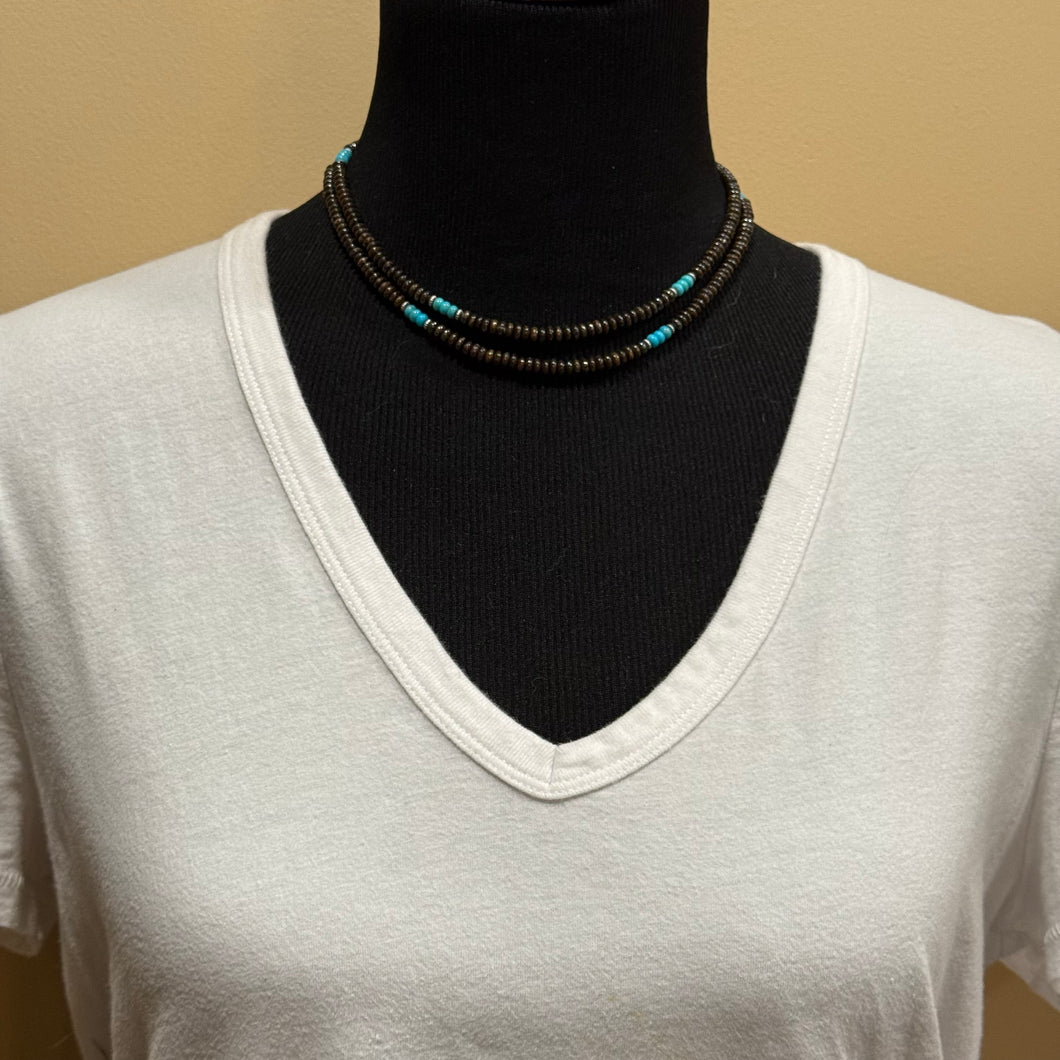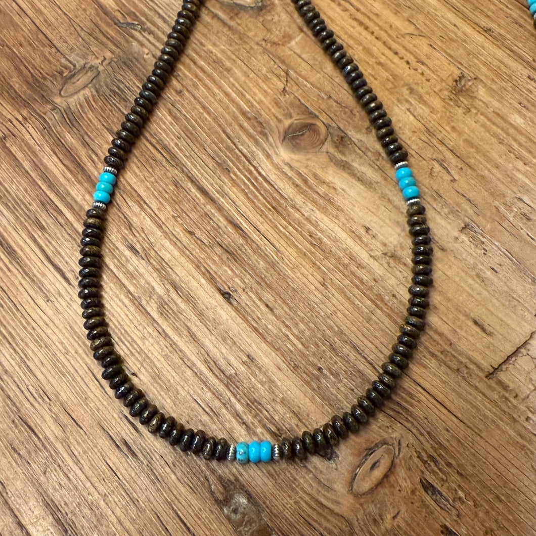 This Bronzite and genuine Turquoise necklace features 4mm Bronzite rondelles, 4mm turquoise rondelles and sterling silver 3.3mm corrugated saucers. The end rings and clasp are sterling silver. This necklace is 32.75 inches long, giving you the option to wear it doubled or wear it long. This piece also layers well with Navajo pearls.