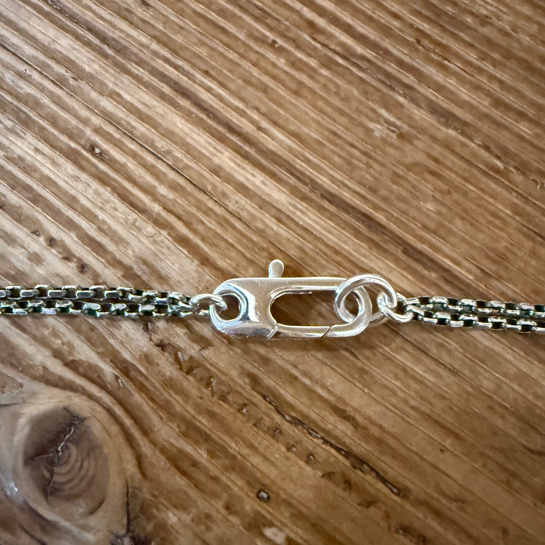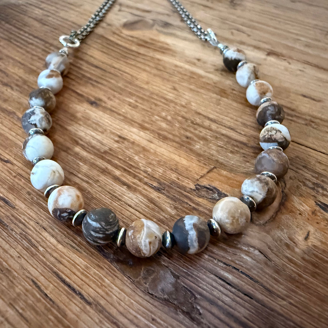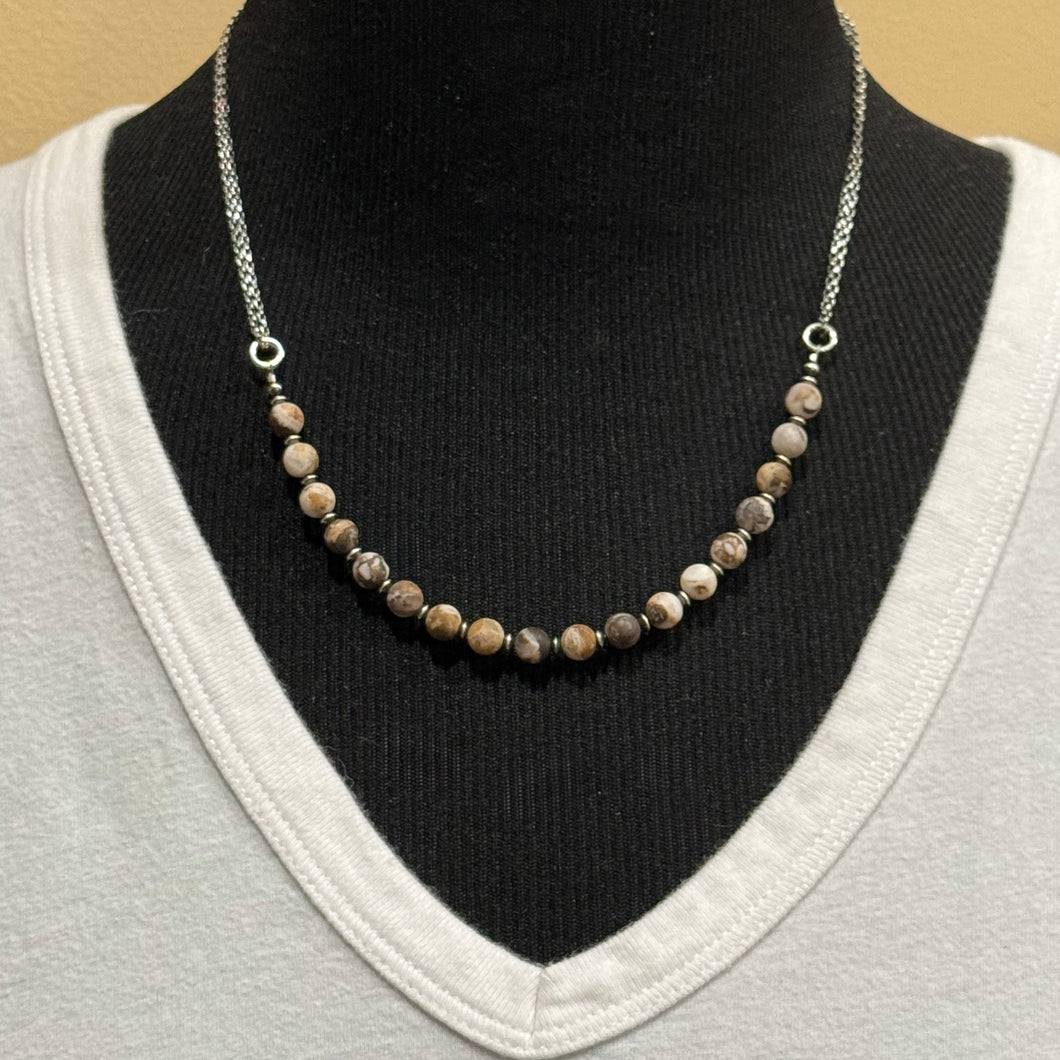 Petrified wood opal and sterling silver necklace featuring 6 mm matte wood opal beads, 3.3 mm saucers, and 3 mm Navajo pearls. The saucers and pearls are sterling silver, not plated. A Double strand of lightly oxidized sterling silver boxy cable chain completes the necklace. A simple and rustic design that is neutral and layers easily. This necklace is approximately 19 3/4 inches long.