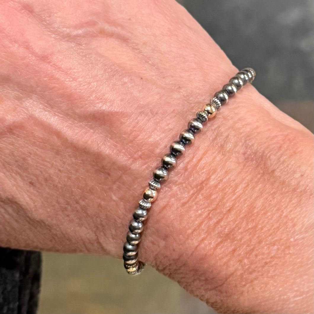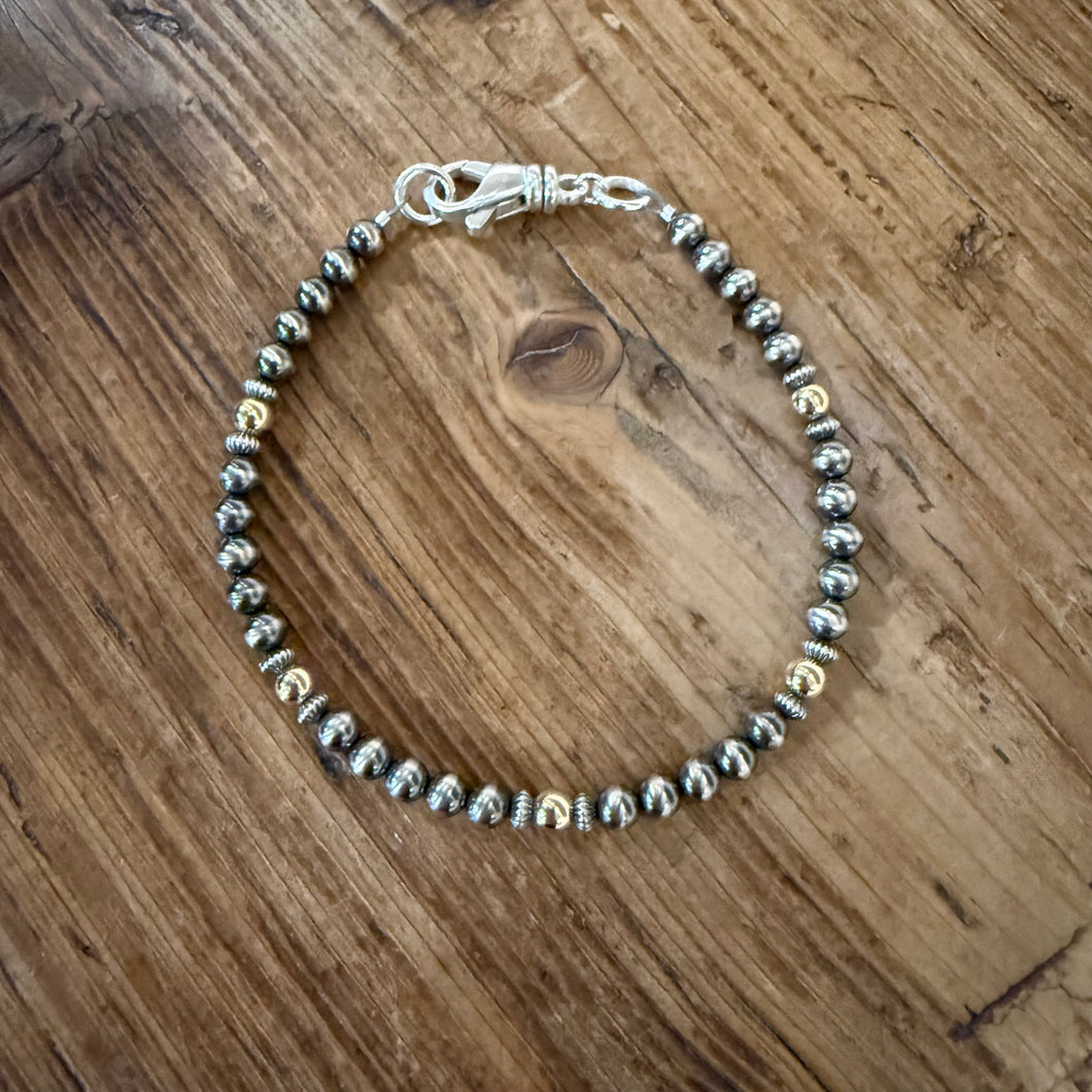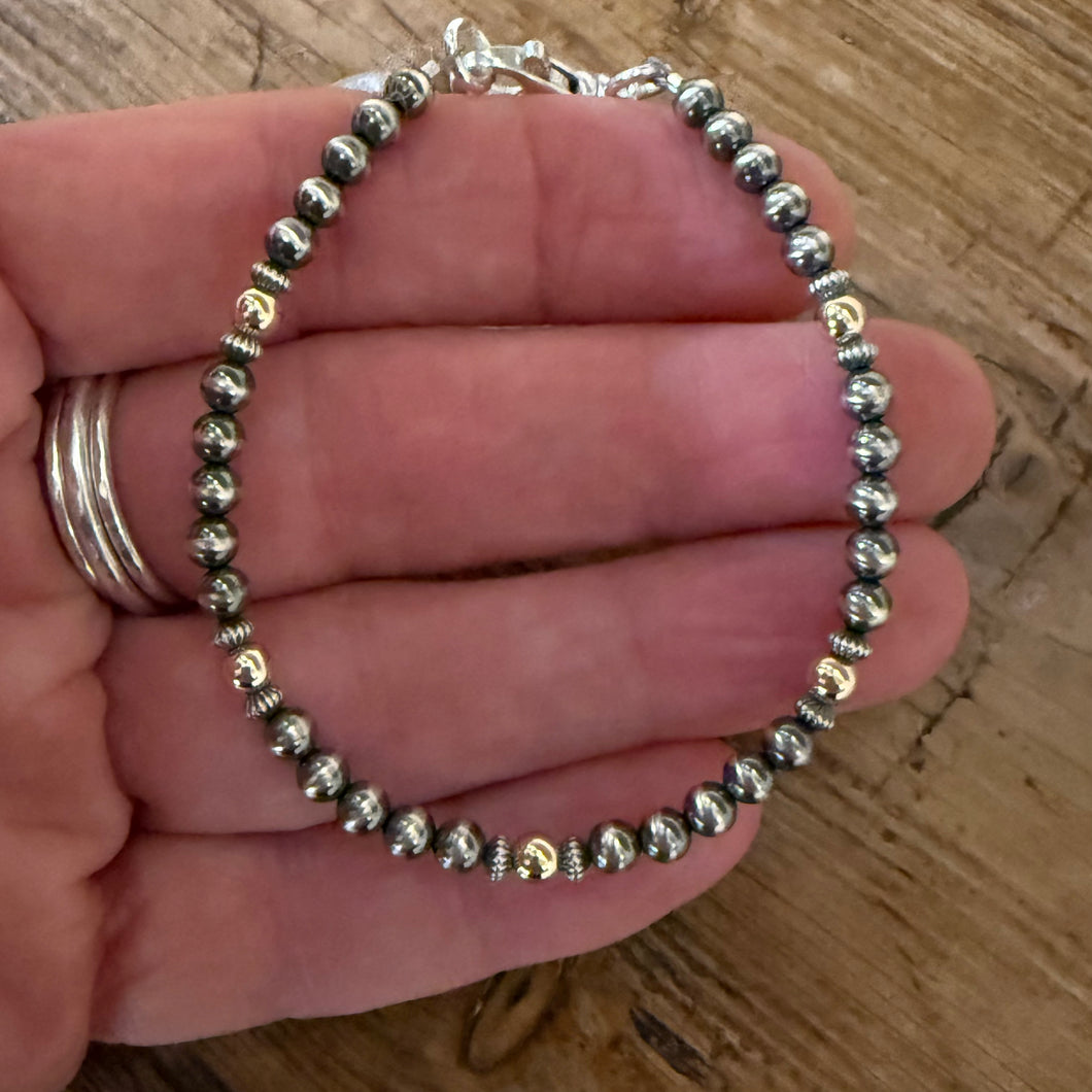 Sterling silver Navajo pearl and 14k yellow gold bracelet. The Navajo pearls are 4mm in size. They are sterling silver- not silver plated. The 14k yellow gold 4mm beads sit in between sterling 3.3mm corrugated saucers. The gold beads are 14k, not plated. Sterling silver end rings and swivel clasp. Southwestern style with a small pop of gold! Stack it with turquoise, beaded bracelets or cuffs. This bracelet is approximately 7 3/8 inches long.